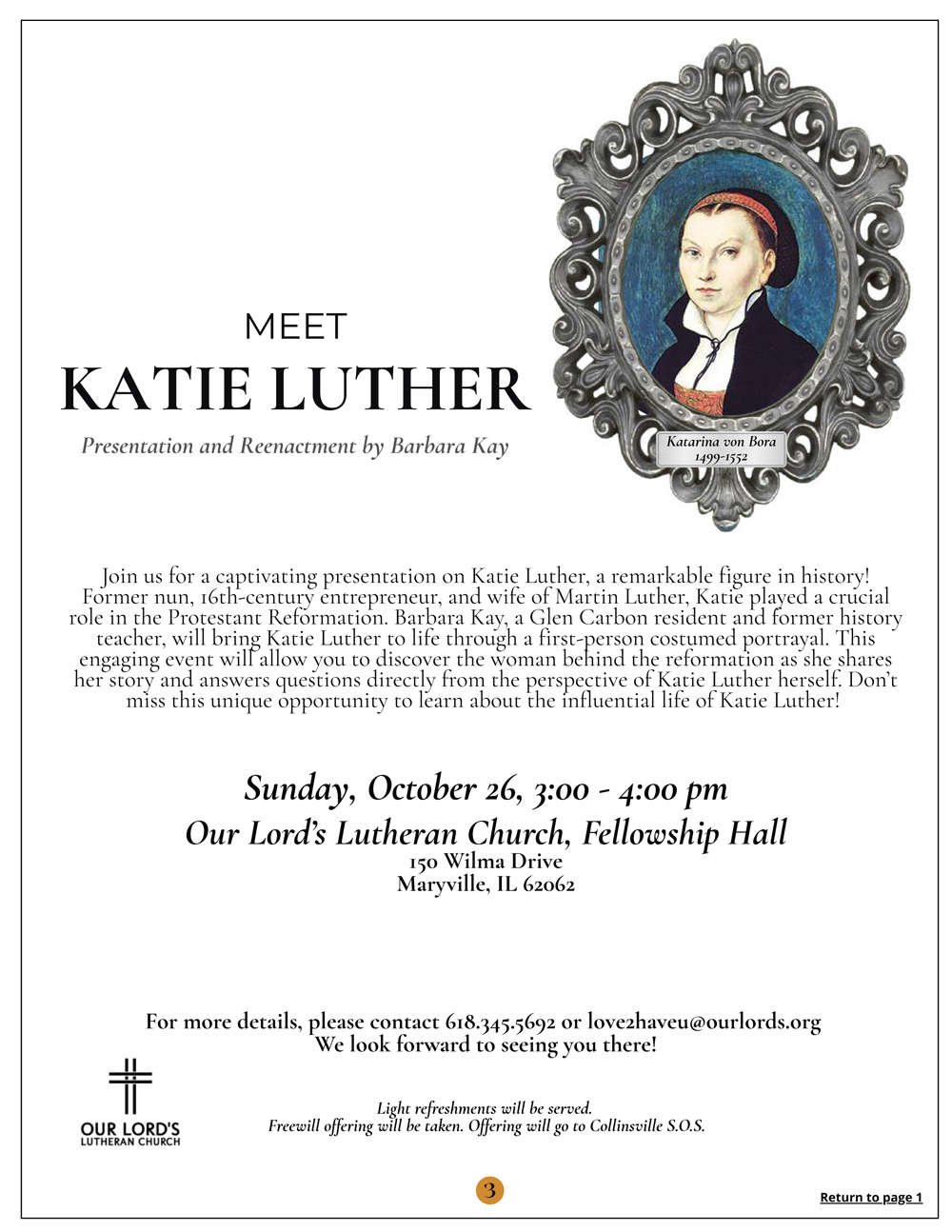 Presentation and Reenactment by Barbara Kay on Katie Luther, wife of Martin Luther. Discover the woman behind the reformation as she shares her story and answers qustions directly from the perspective of Katie Luther herself.